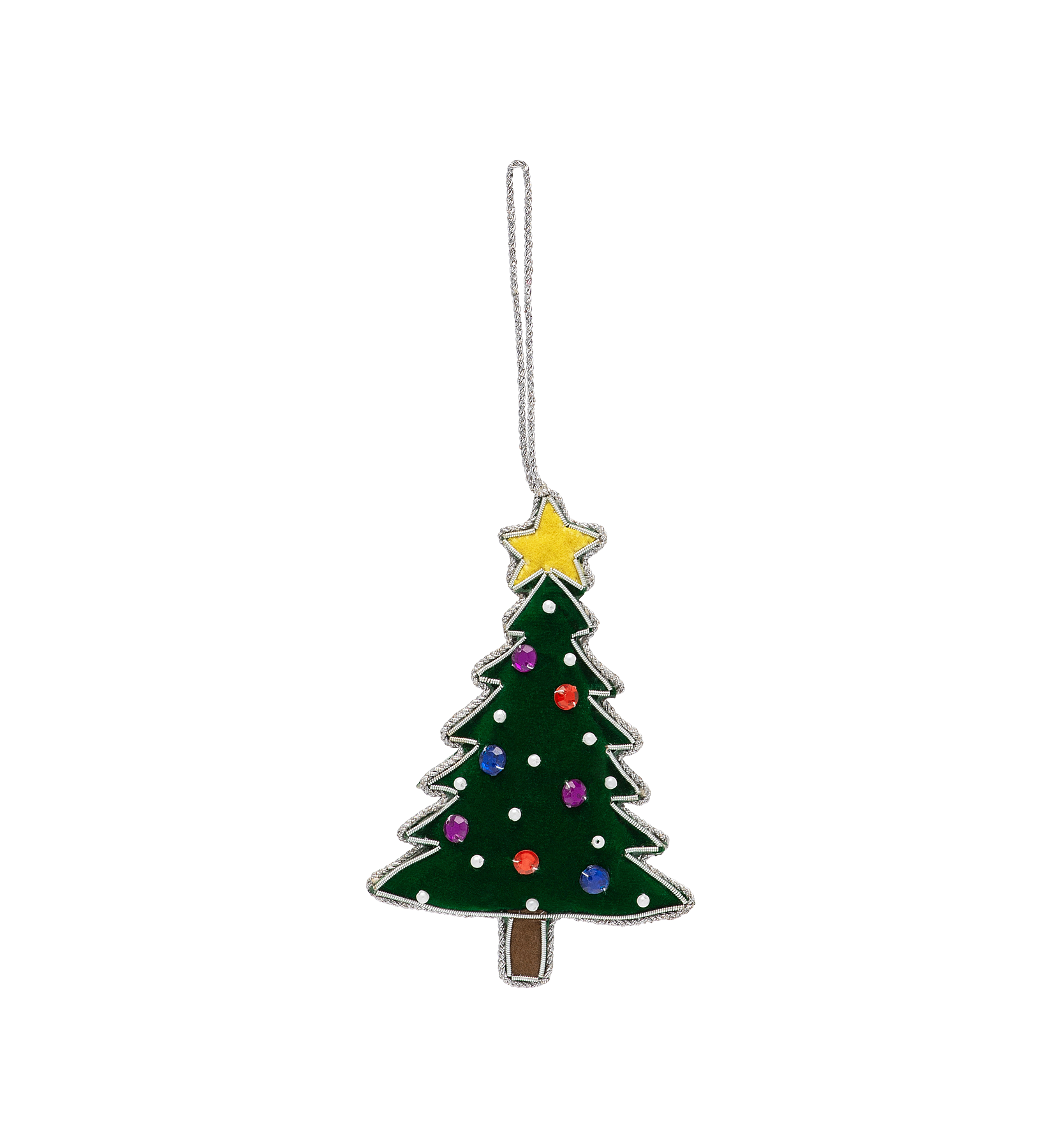 Het Kerstboomornament is een prachtige handgemaakte kerstdecoratie met magische details aan een glinsterend zilveren koord. Laat deze decoratie uw gasten verbazen en uw kerstboom betoveren.