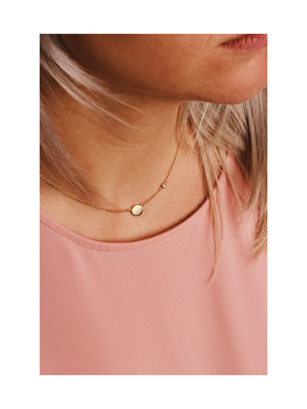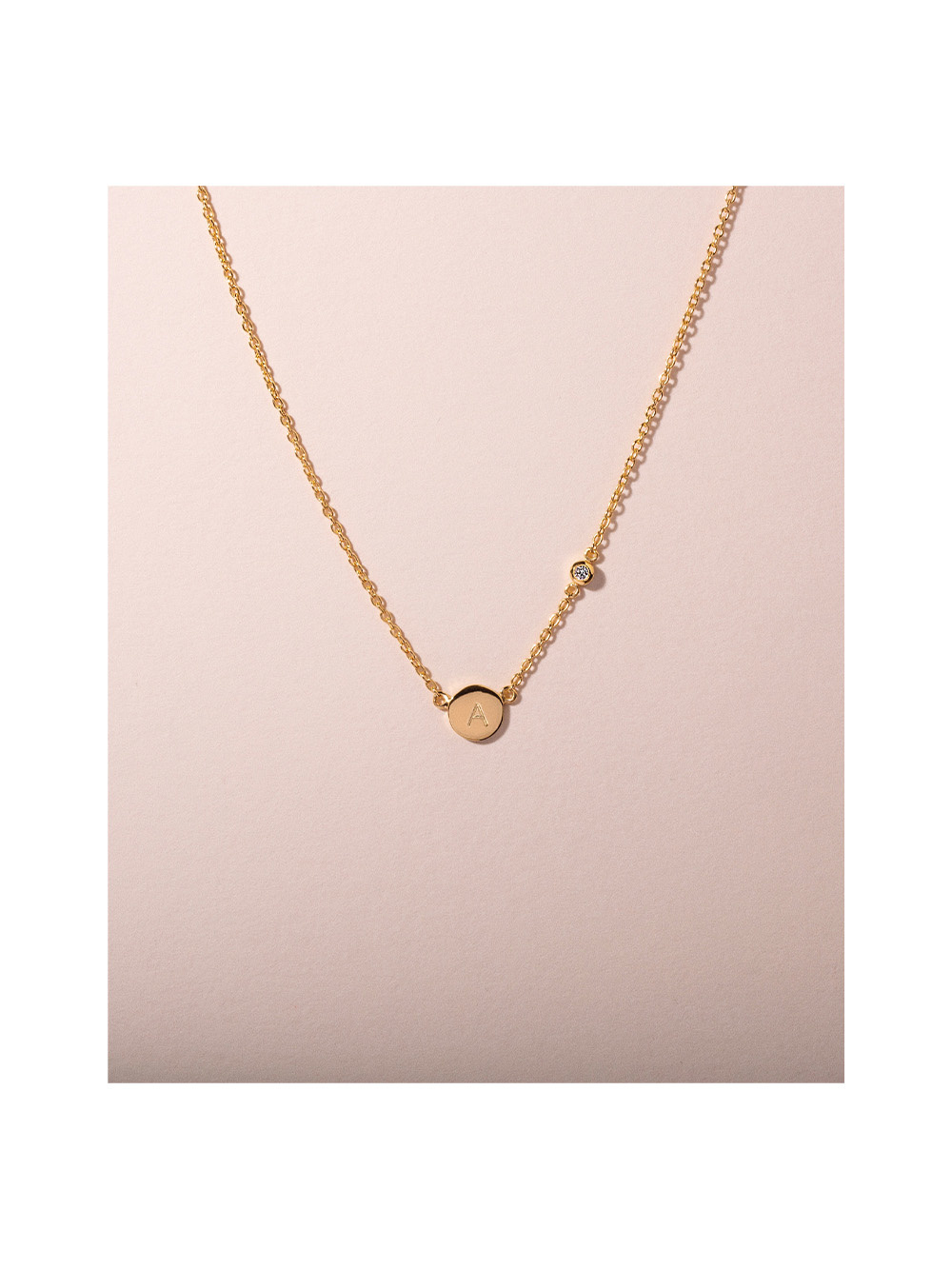 prachtig ketting met in goud het midden een ronde bedel en iets uit het midden een klein diamandje. de ronde bedel kan je laten personaliseren met een initiaal. de ketting is er in 3 verschillende maten, mama-petite-baby