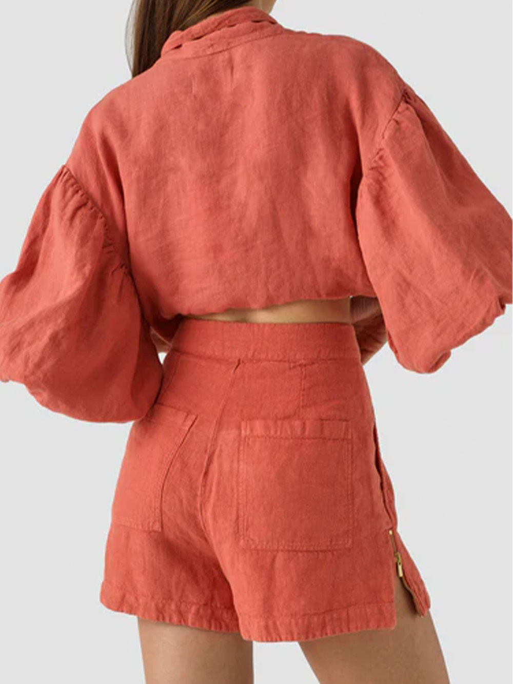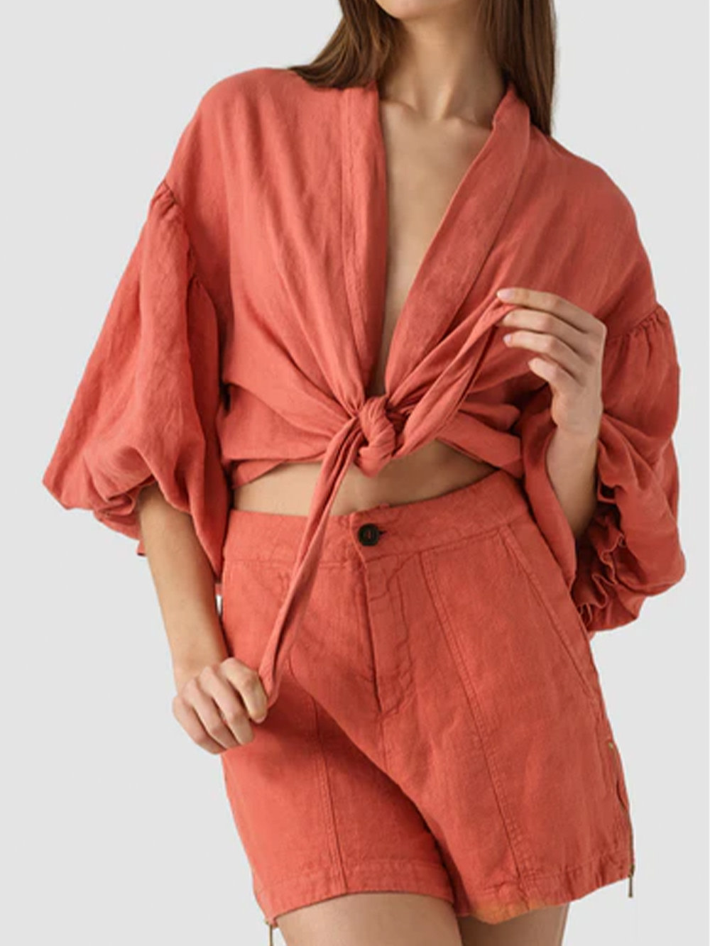 Zomerse verfijning: Combineer de Mecca-kleurige shorts met een witte tanktop en een lichte, luchtige kimono voor een zomerse en verfijnde look. Voeg sandalen met sleehakken toe voor wat extra lengte en stijl. Accessorize met een paar delicate armbanden en een strooien hoed voor een chique touch.