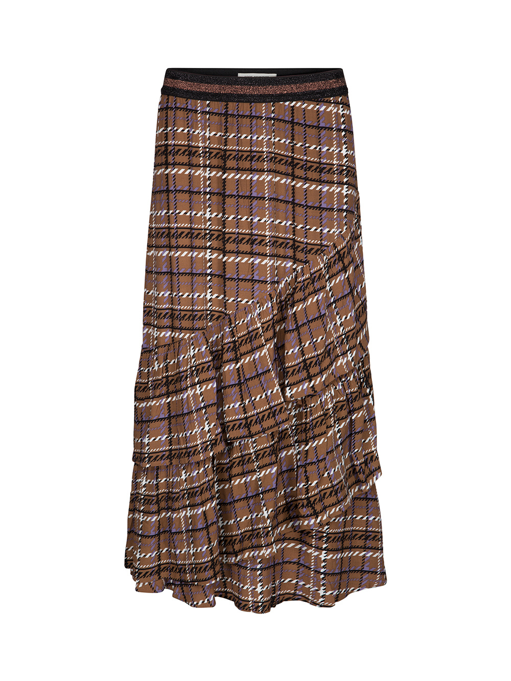 MOOIE MAXI ROK MET ONDERAAN DRIE SCHUINE RUFFLE LAGEN EN GLITTER ELASTIEKBAND IN DE TAILLE. MOOI DETAIL OP DE BRUINE ROK IS DE PAARS/WIT/ZWARTE RUIT PRINT.